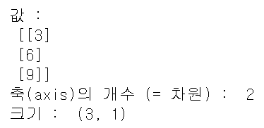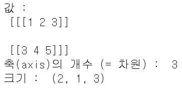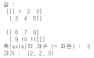 print('축(axis)의 개수 (= 차원) : ',three_d_tenser.ndim)