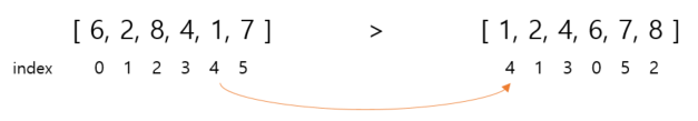 원소 1의 본래 인덱스는 4이고 / 원소 2의 본래 인덱스는 1이고 ... / 원소 8의 본래 인덱스는 2이므로