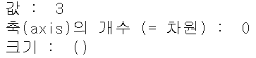 print('축(axis)의 개수 (= 차원) : ', zero_d_tenser.ndim)