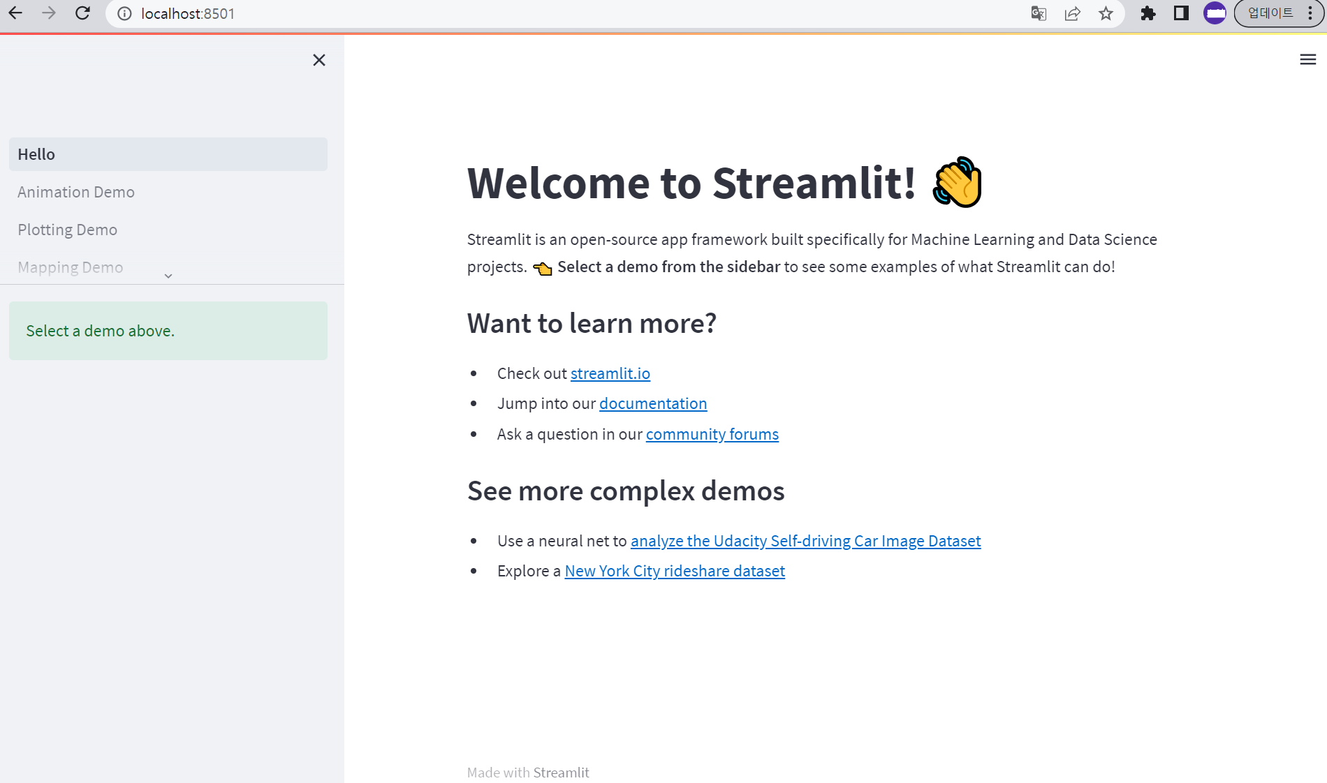 이후 아래 명령어로 Streamlit 데모 페이지를 볼 수 있다.